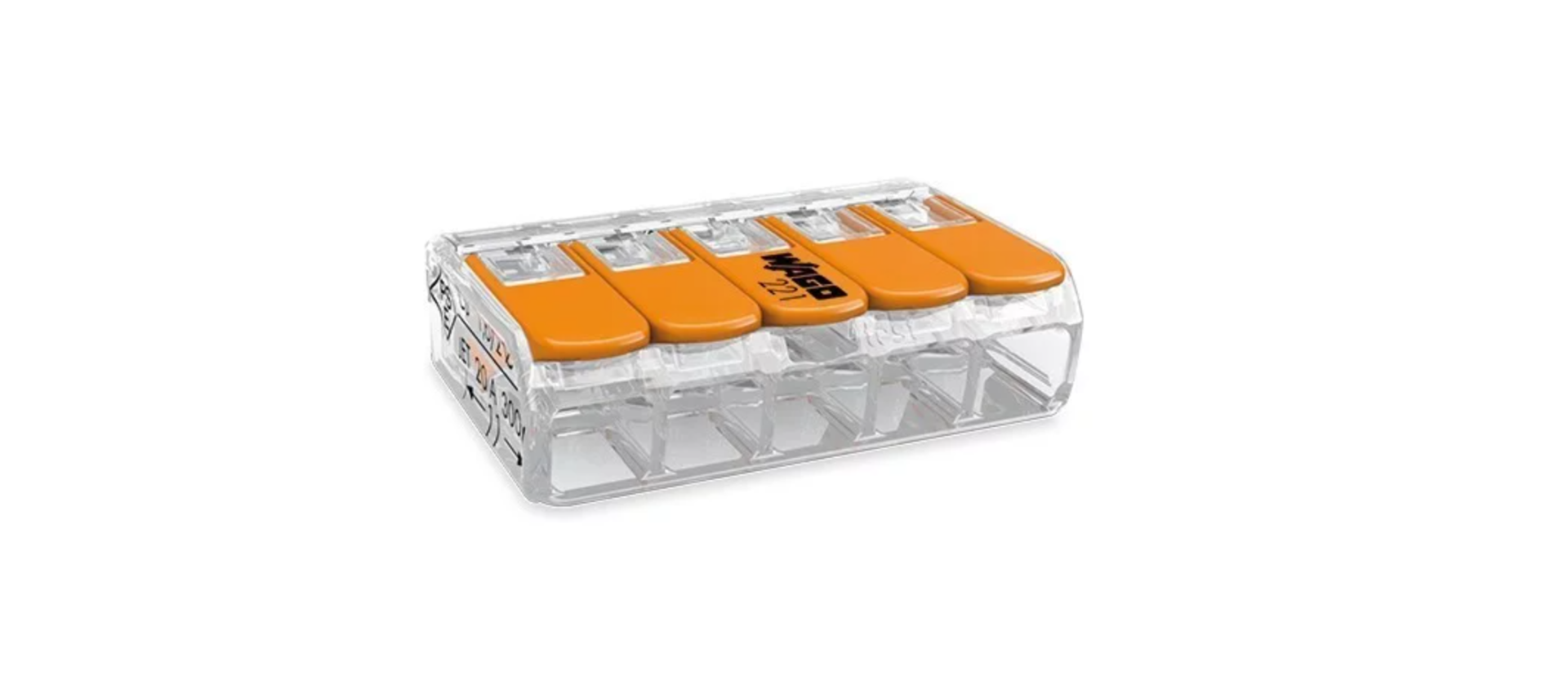 Wago 221-415 vezeték összekötő 5 x 0,2-4mm2 -es tömör és sodrott vezetékhez, oldható, lapos kivitel , átlátszó házban / doboz(25db)